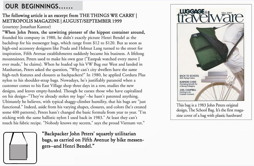 또한 1980년대에 이스트팩이 존피터의 가방 디자인을 카피했다고 존피터가 불평을 하는 아티클이 지금도 검색되는 것을 본다면 존피터가 뉴욕 패션, 특히 가방 디자인에 있어서 얼마나 대단한 헤리티지인지 알수 있습니다.