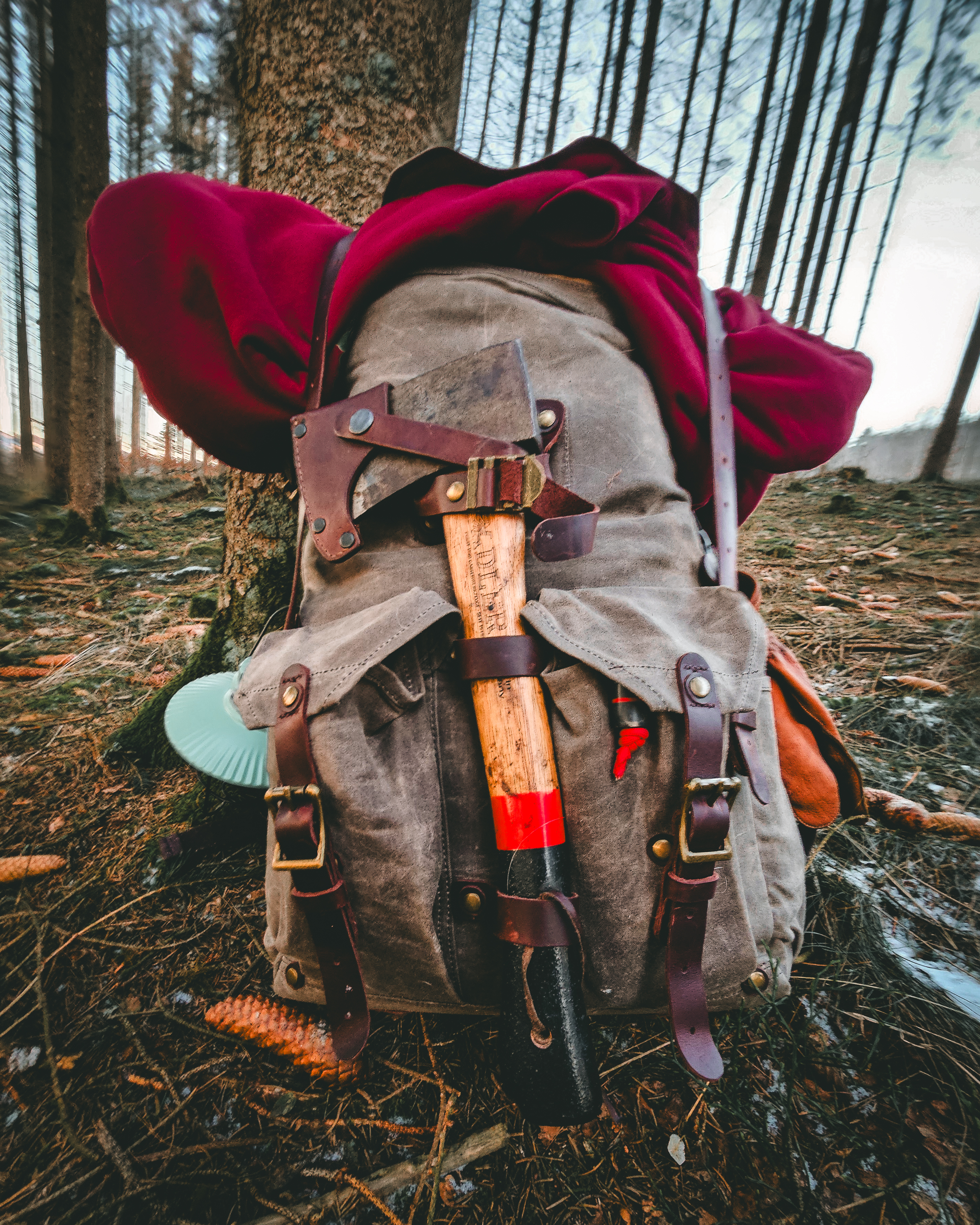 전면에는 손도끼를 거칠할 수 있는 홀더가 있고 바닥에는 가죽 패치가 있어서 담요를 연결할 수도 있습니다. 측면에는 링 고리를 걸수 있게 되어 있기 때문에 필요한 스탠리스 물컵이나 오일렌턴 등을 거치하기에 좋습니다.